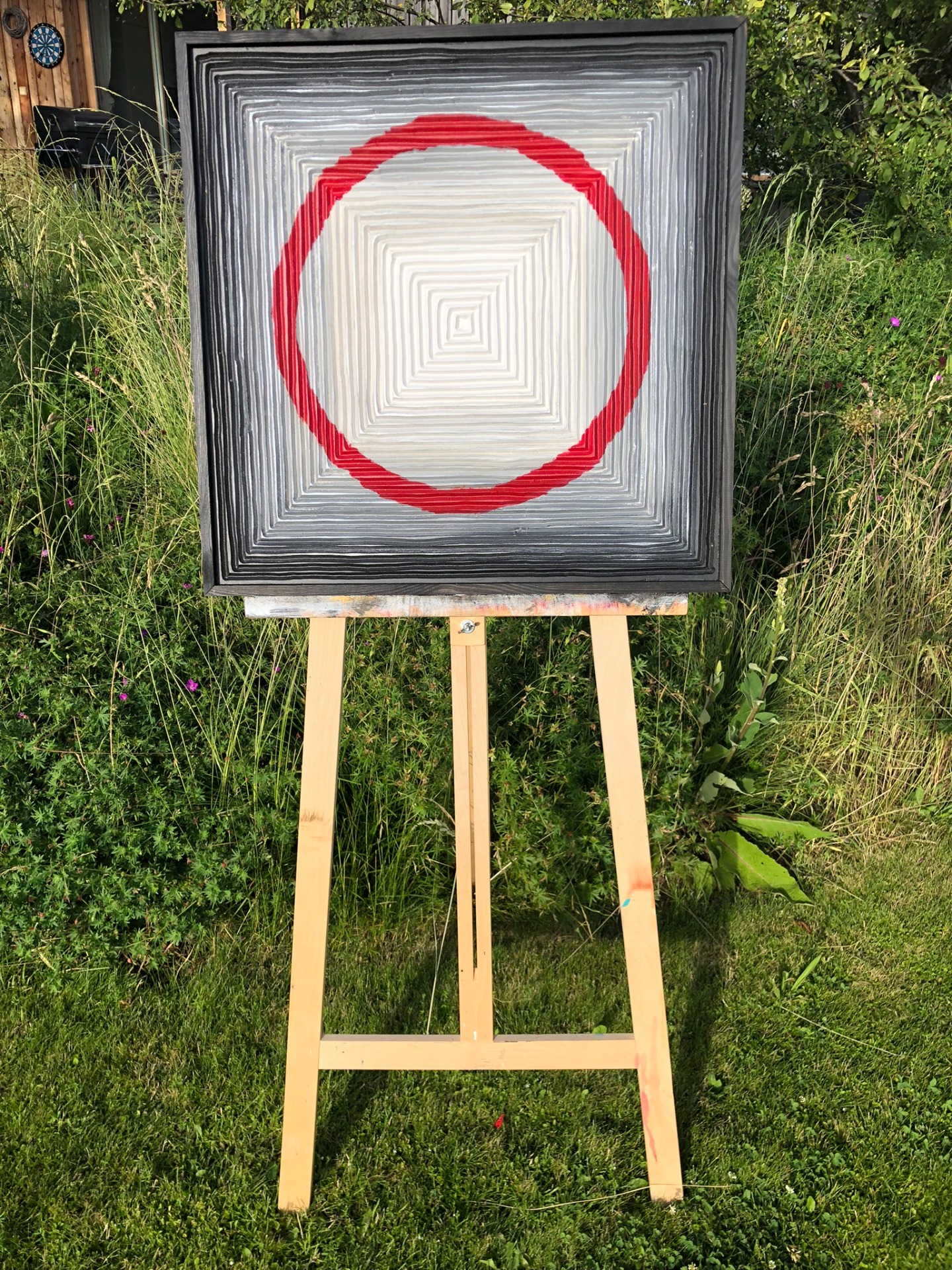 Je to střet čtverce a kruhu, stability a pohybu, řádu a nekonečna. Černobílá základna vytváří tiché pozadí pro hlasitou, nekompromisní rezonanci červené. Obraz vyzývá k zamyšlení nad dualitou existence, nad napětím mezi formou a esencí, mezi tím, co je pevné, a tím, co neustále proudí. Nechť vás tento vizuální paradox vtáhne do vlastní vnitřní rezonance.