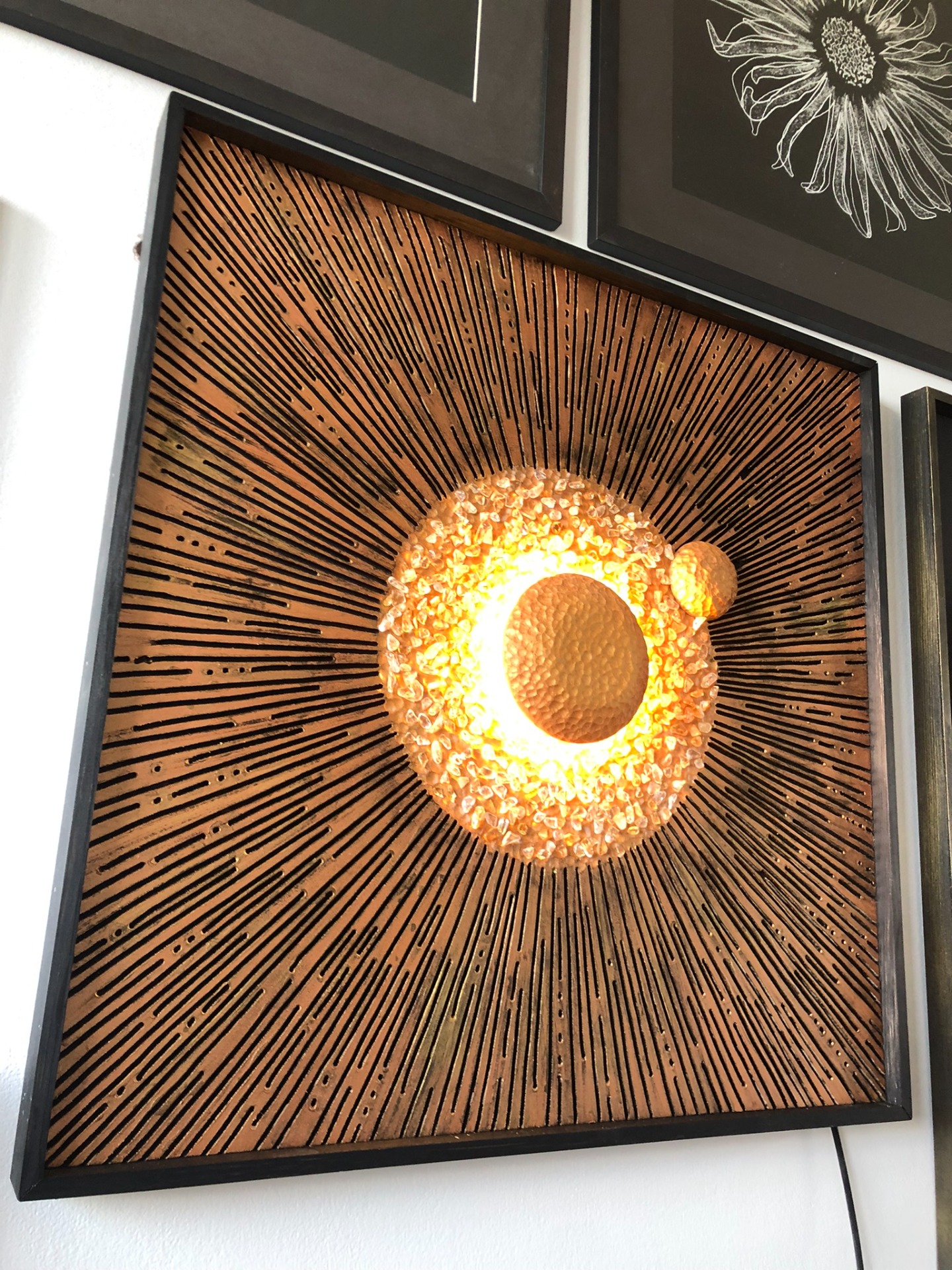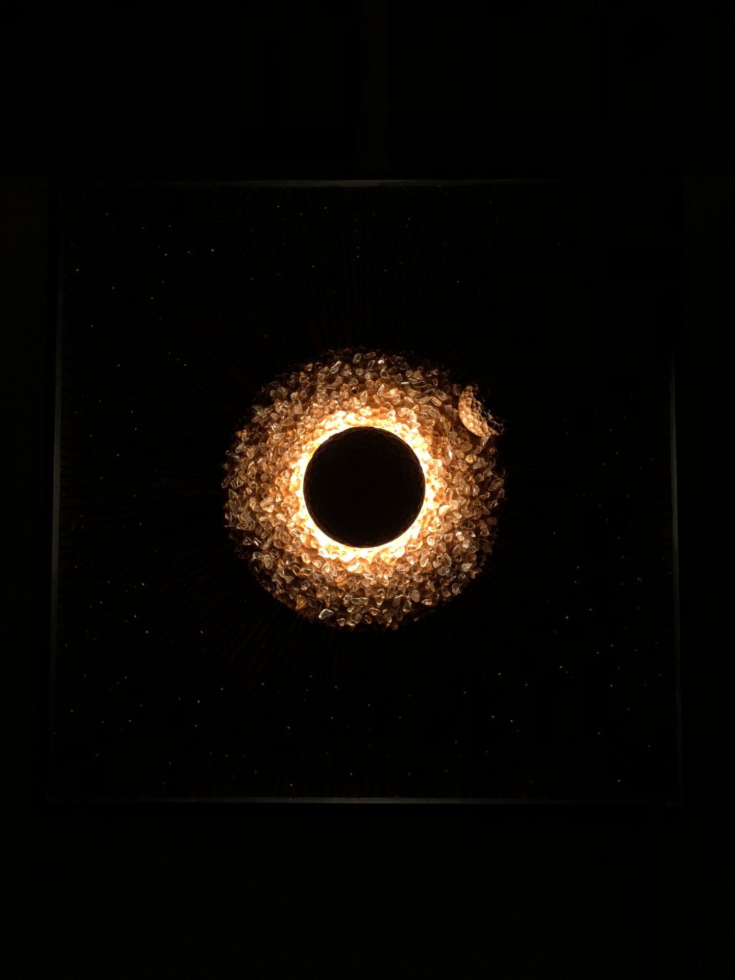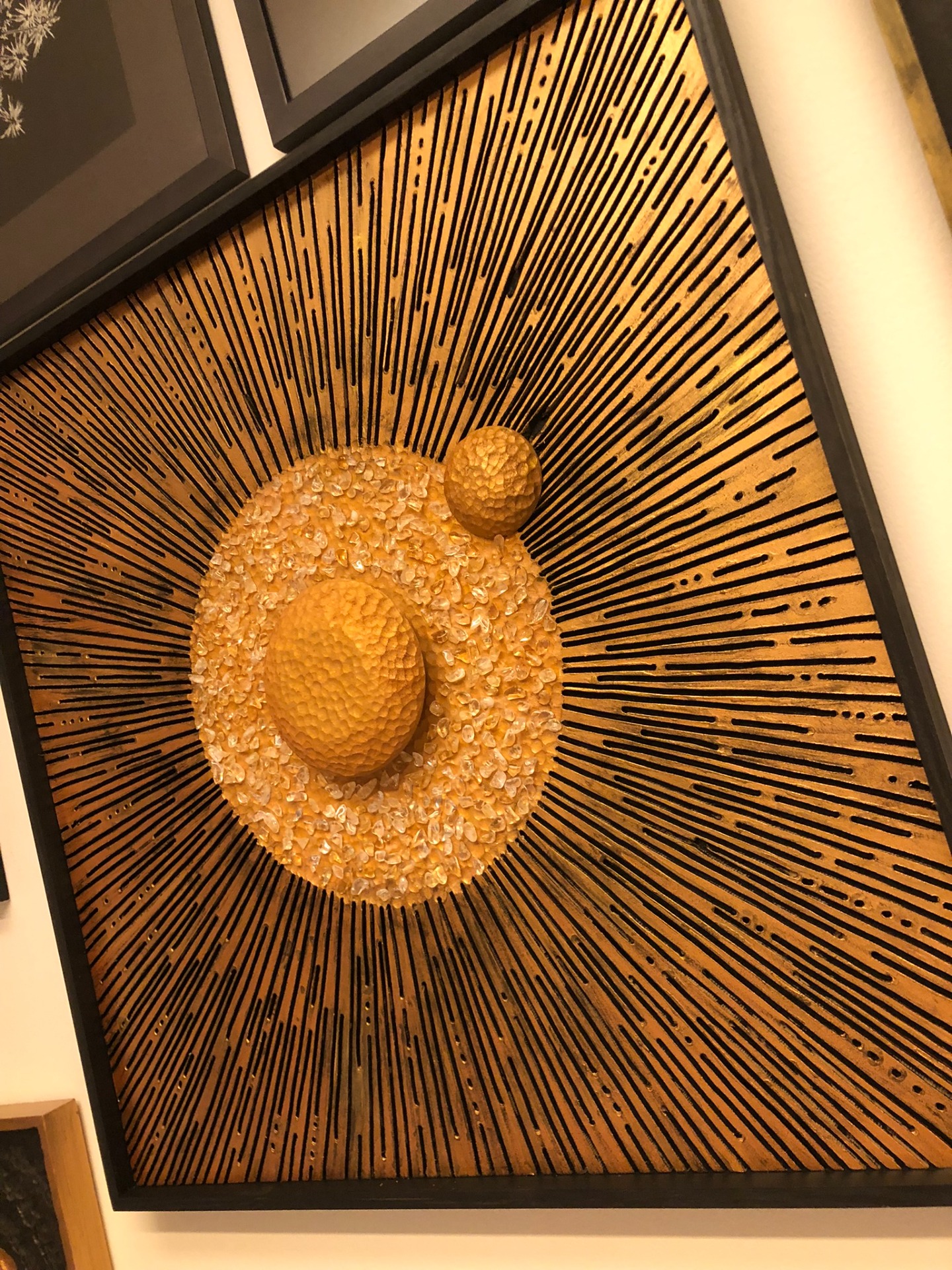 Zásadní podstatou celého obrazu je světlo vycházející ze samotného středu, které se láme v kamíncích citrínu. Tak se rozbíhá po celém obraze v různých tvarech a odstínech. To vše je podpořeno reliéfní strukturou obrazu a odstíny zlaté v kombinaci s černou barvou.